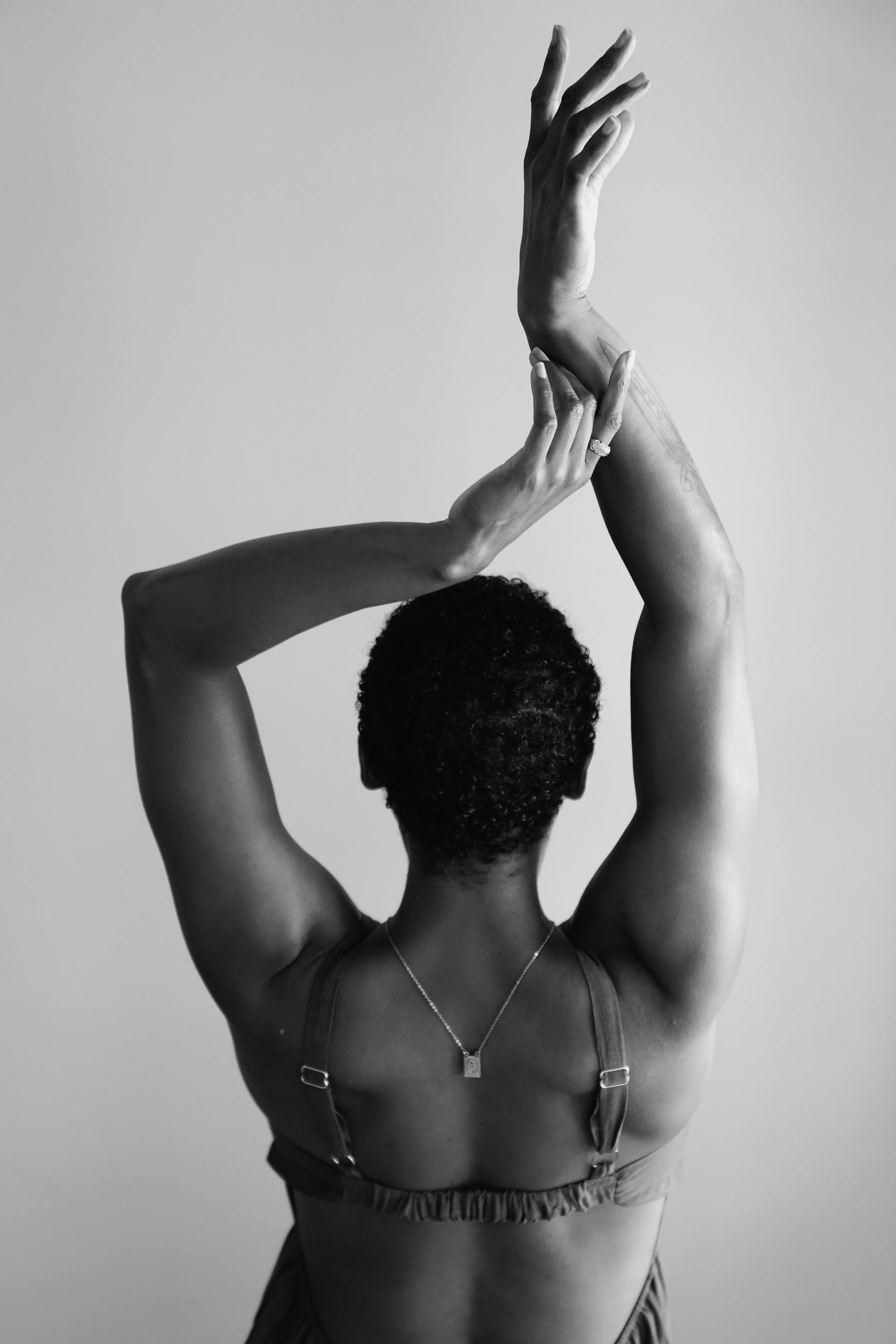 Black and white photo of a woman from behind, arms raised, wearing a necklace and straps on her shoulders.