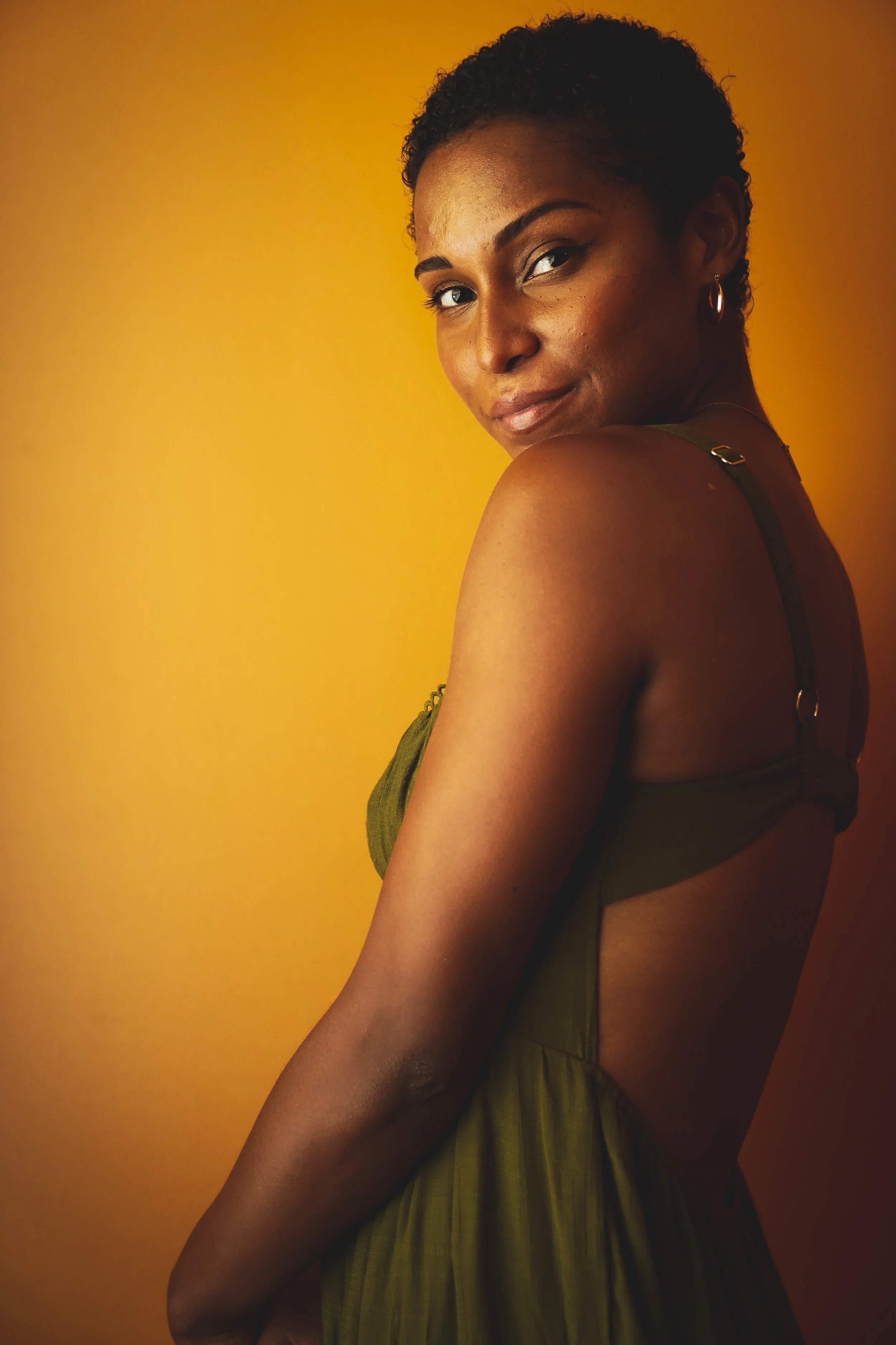 Woman in a green dress with a low back against an orange background, looking over her shoulder.