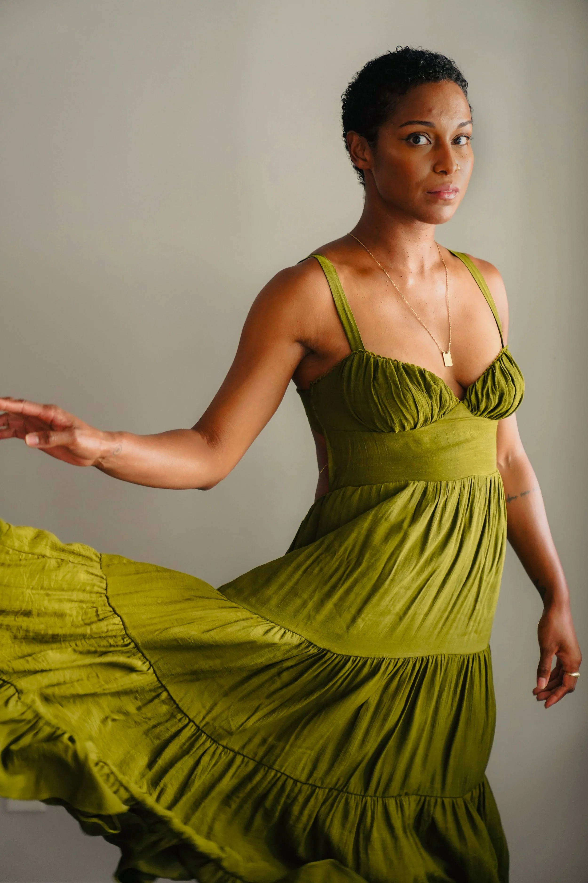A woman in a green dress poses confidently, showing the flow of the fabric.